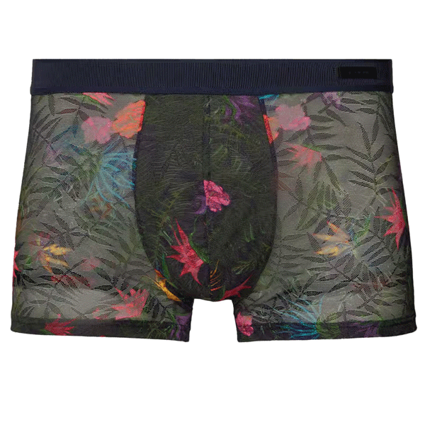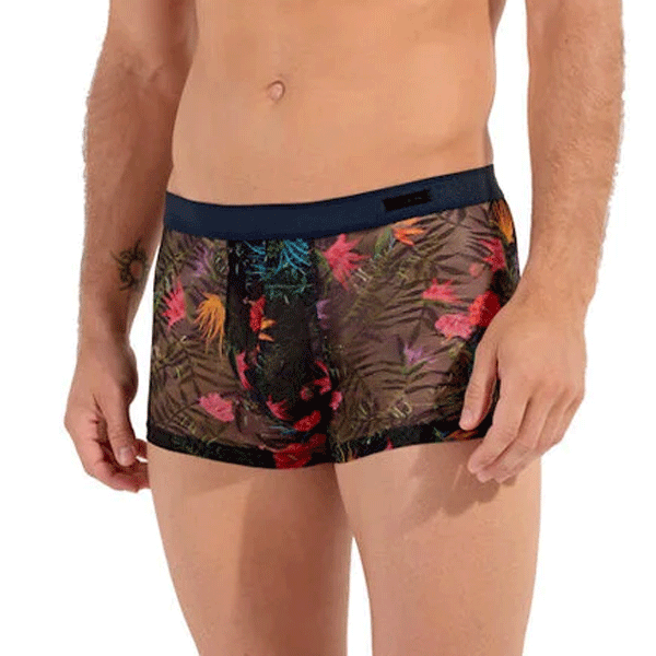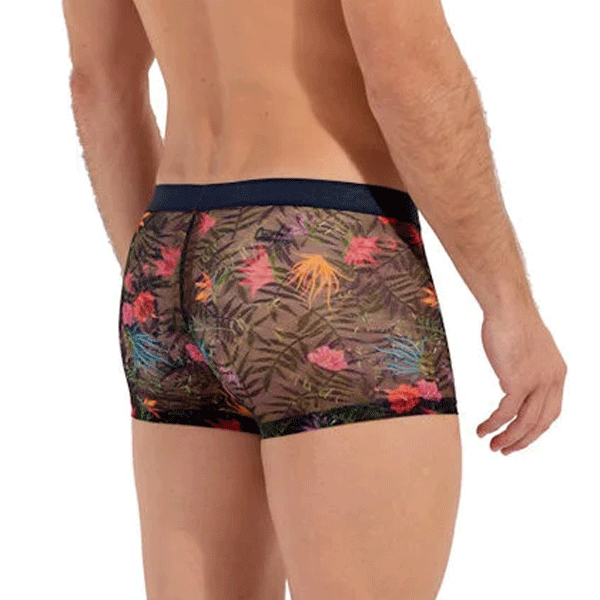 De Exotica – Boxer Brief is een uitdagend en tropisch element in de HOM Temptation lijn. De Exotica is gemaakt van een sierlijke mesh met een prachtig kleurrijk patroon met rode, gele en roe tropische plantmotieven op een achtergrond van groene bladeren.