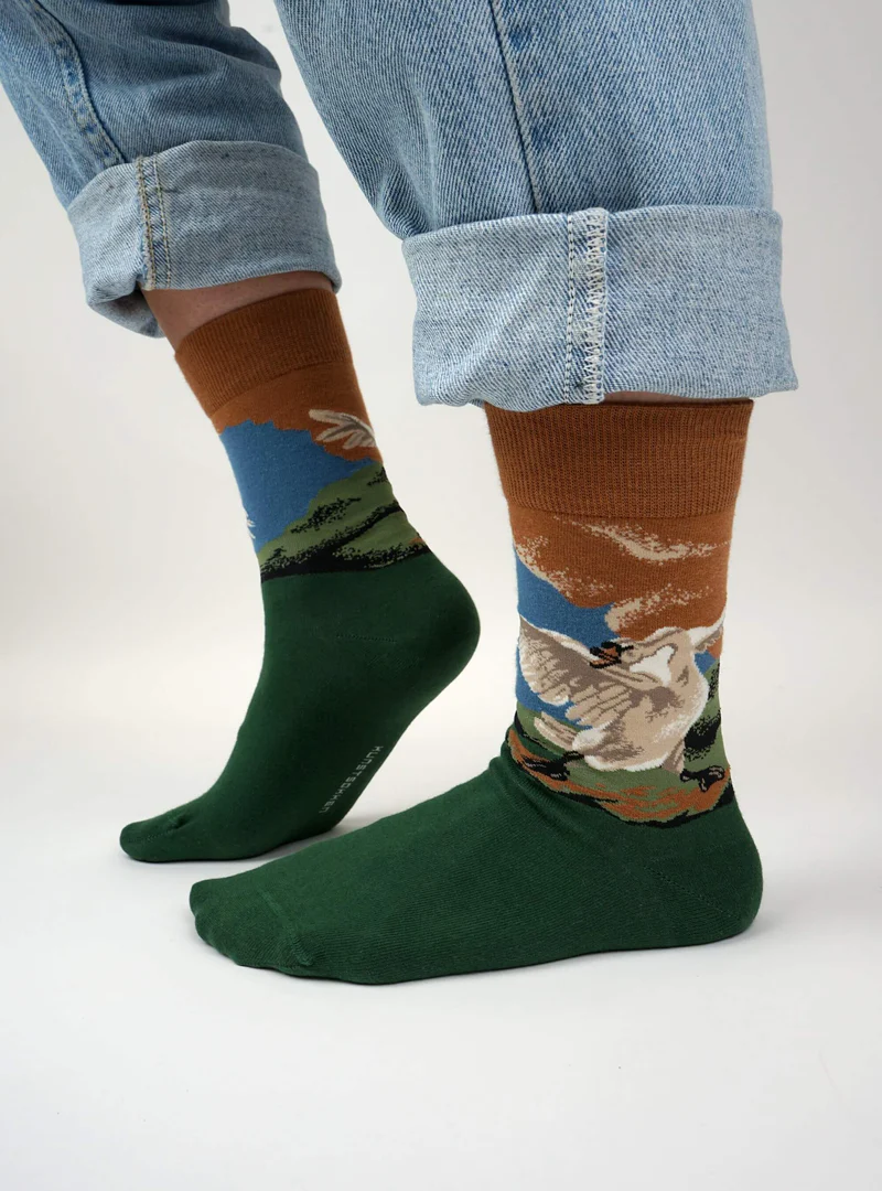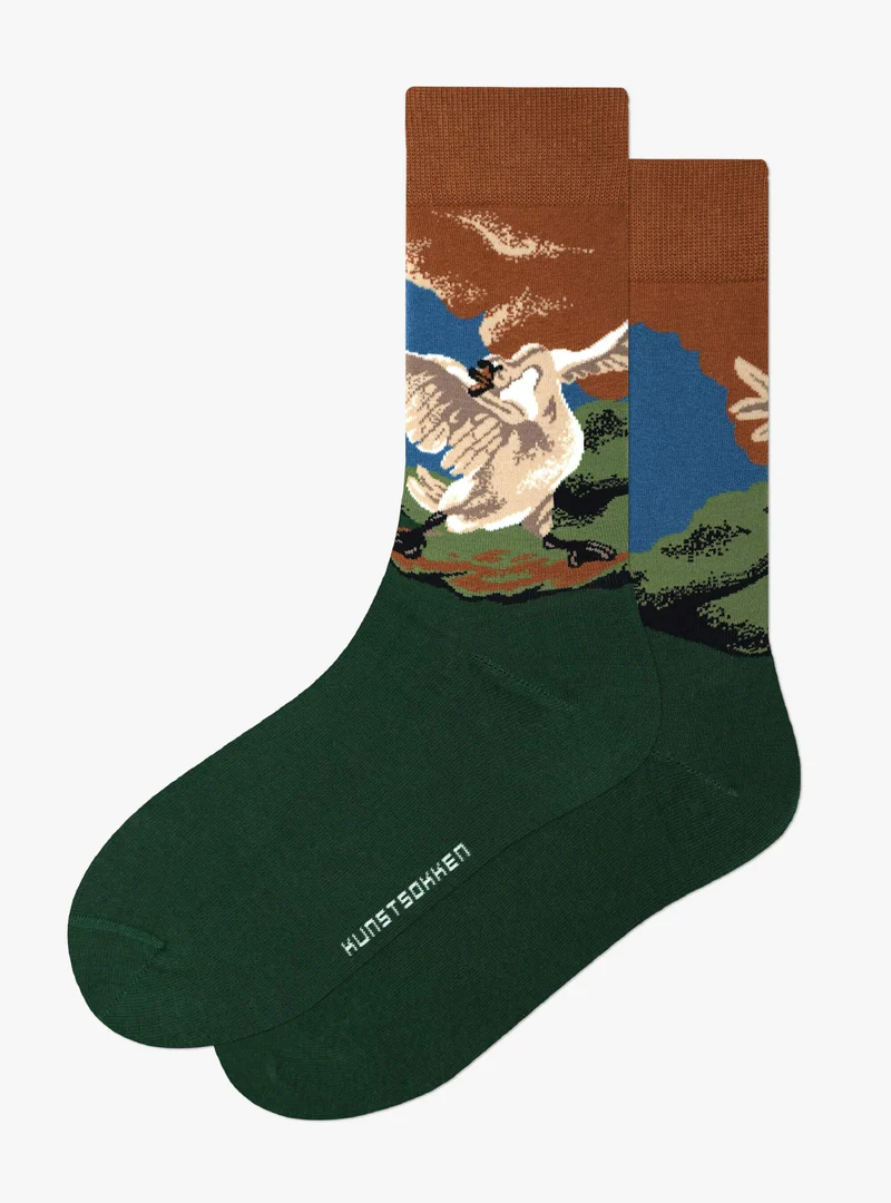 Jan Asselijn’s “De Bedreigde Zwaan” (1650) verbeeldt een zwaan in gevecht om zijn nest te beschermen, een symbool van moed en elegantie. Deze sokken brengen dit krachtige beeld tot leven op je voeten, waarbij elke stap de tijdloze strijd tussen schoonheid en bescherming belichaamt.