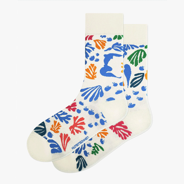 De levendige vormen en pure kleuren tonen Matisse’s meesterschap in het creëren van vreugde door eenvoud. Deze sok transformeert zijn poëtische visie tot draagbaar kunstwerk.